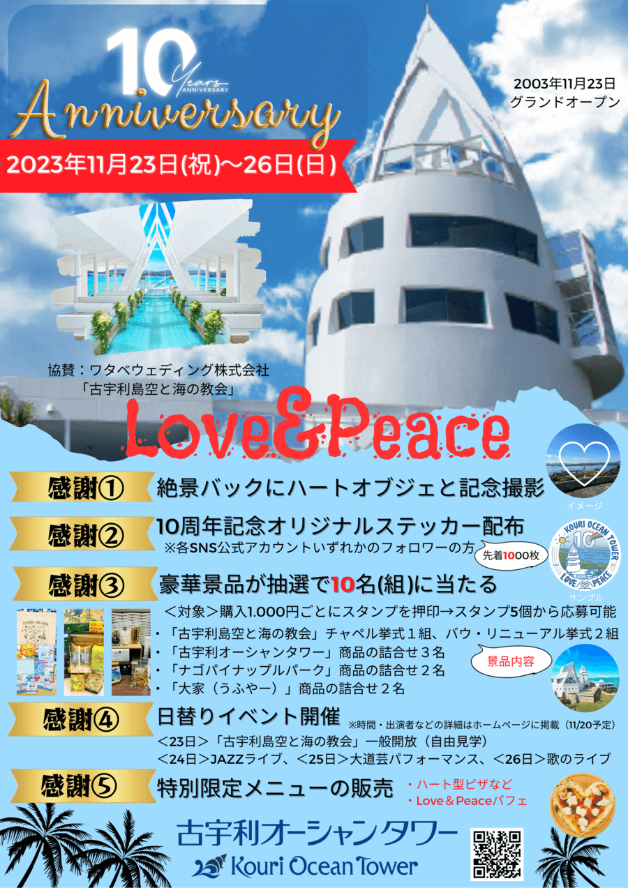 車で行ける離島、古宇利島に「古宇利オーシャンタワー」がオープンしたのは2013年11月23日。今年で開設10周年を迎え、2023年11月23日(木・祝)~26日(日)の期間、感謝祭「10th Anniversary - Love & Peace」が開催される。