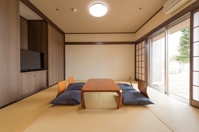 部屋タイプ:コテージ43㎡ 和洋室北西側に点在する7つのコテージ棟はファミリーに人気!ご家族連れや仲間同士でもゆったりとくつろげる広々とした空間が魅力だ。