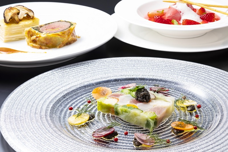 北海道産帆立と県産マグロと旬野菜のテリーヌ キャビア添え