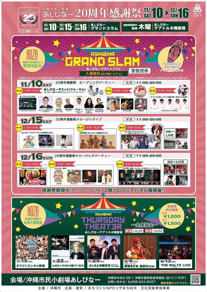 あしびなーの舞台とロビーを使用した大演芸祭りとなっており、初代館長の玉城満氏をはじめ、一夜限りの復活スペシャル「Oh!お笑いけんさんぴん」さらには「あしびなー歌舞団2018」の20周年記念特別公演、その他にもお笑い、人形劇、LIVEなど盛りだくさんの内容になっている。