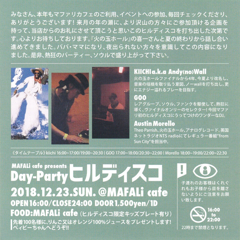 2018年12月23日(日)、那覇市安里の「MAFALi cafe」(マファリカフェ)で「Day Party ヒルディスコ」と題して16時オープンのパーティを開催。早めの時間帯からのオープンやキッズプレート、22時まで禁煙指定など、夜なかなか出られないパパ・ママも楽しめるようにと企画されたイベントだ。