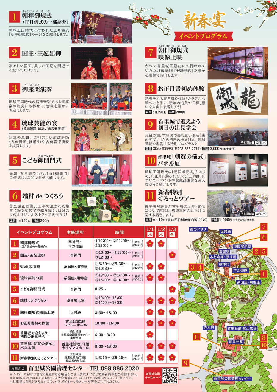県立芸術大学琉球芸能専攻と首里伝統芸能文化協会(首里振興会)による琉球芸能の宴も披露されるので、首里城の「新春の宴」にどっぷりと浸りながら新年を迎えよう。