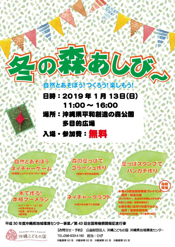 2019年1月13日(日)、糸満市にある平和創造の森公園にて「冬の森あしび~ 」が開催。本格ブーメランや小枝や木の実で工作体験のネイチャークラフトなど自然と遊べる貴重な体験ができる。