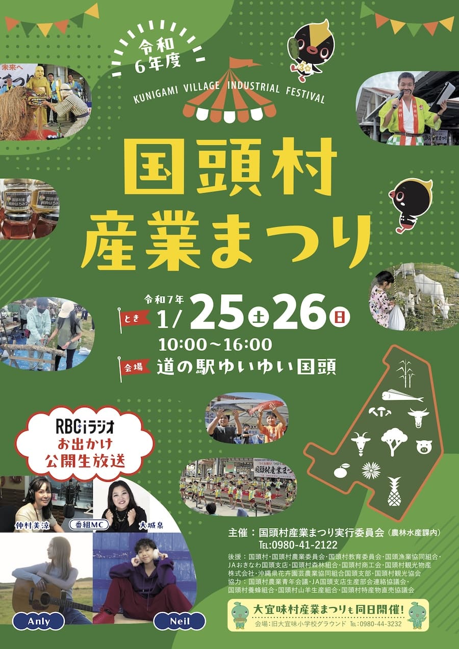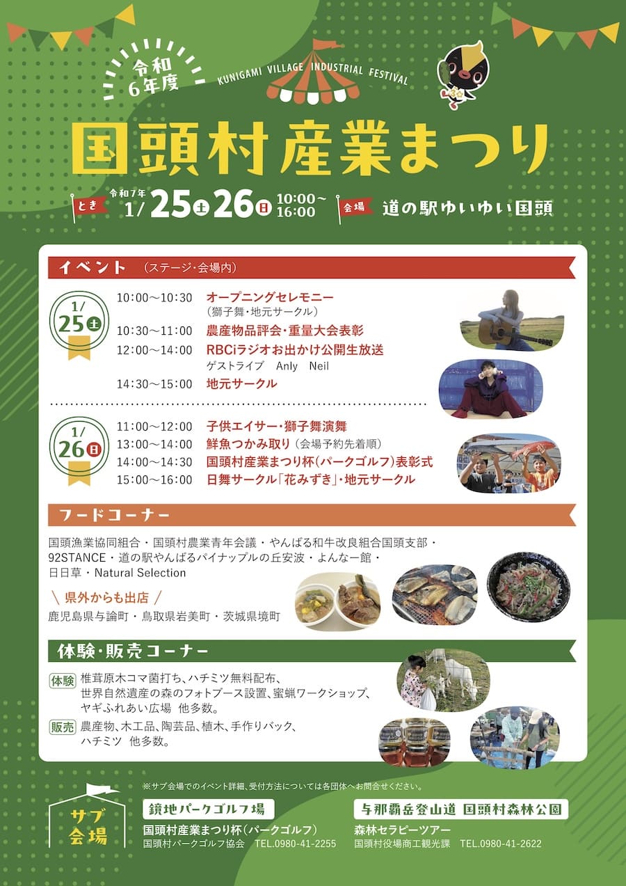 2025年1月25日(土)・26日(日)の2日間、国頭村の「道の駅 ゆいゆい国頭」にて「令和6年度 国頭村産業まつり」が開催される。