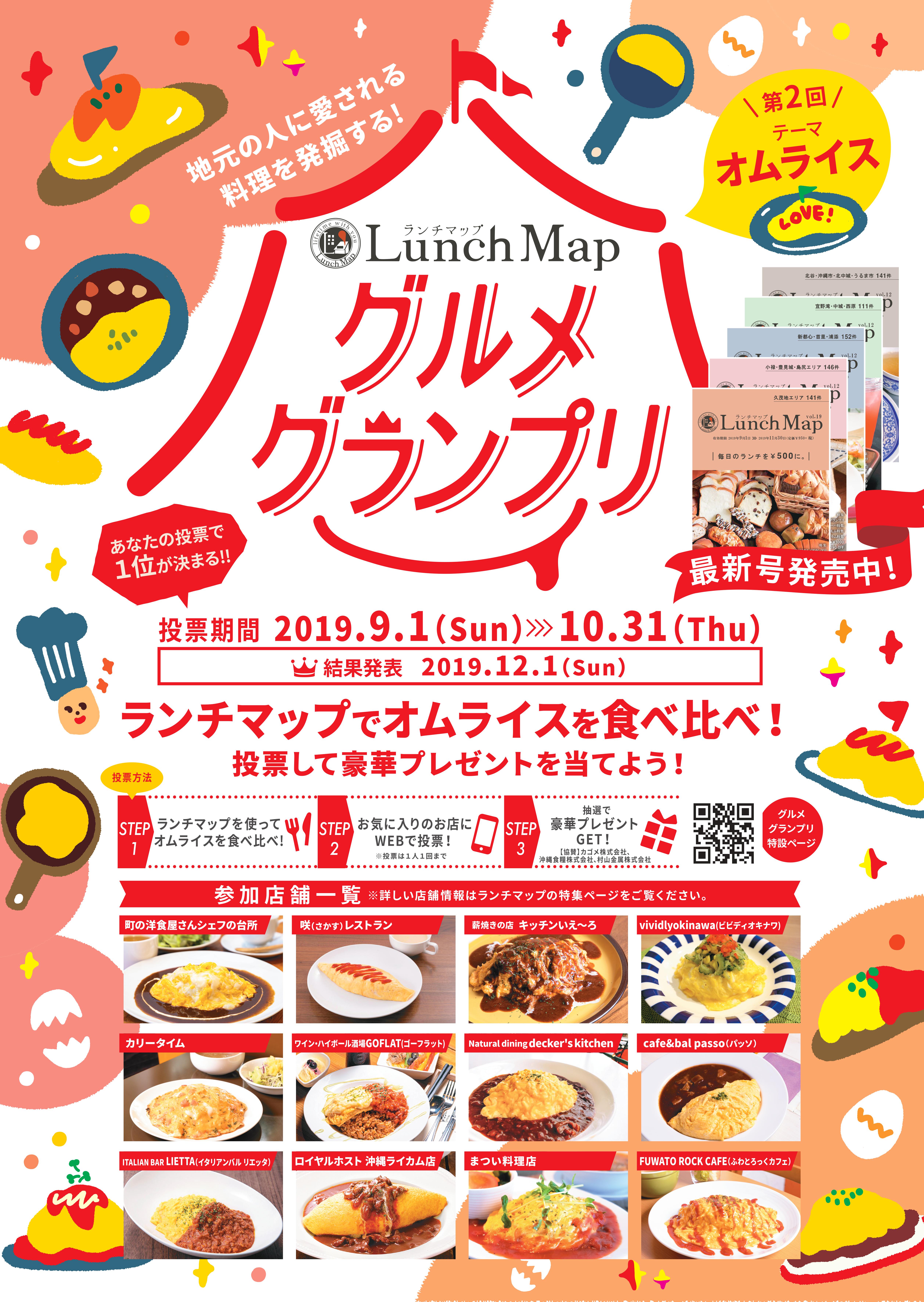 2019年9月1日(日)~10月31日(木)、ちゅらとく姉妹媒体のランチマップより「第2回 ランチマップグルメグランプリ」が開催される。「ランチマップグルメグランプリ」とは、地元の人に愛される名物料理を発掘することを主旨としたグルメイベント。⇒ランチマップの詳細はこちら(スマホ専用サイト)