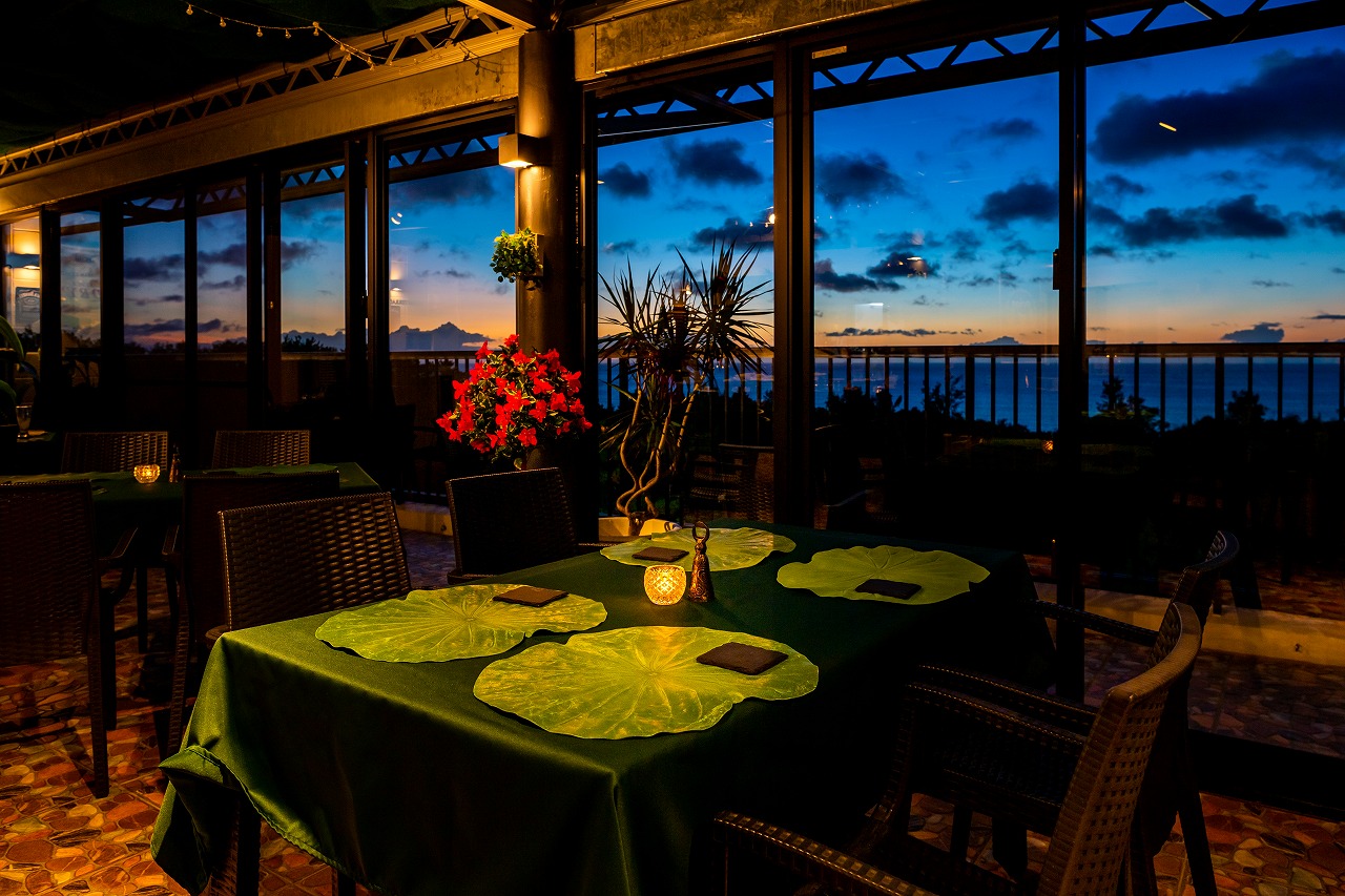 ◆Ocean Terrace/鉄板焼き・肉料理事前予約限定で、やわらかい肉質が特徴なアンガス牛の牛フィレコースが1,000円OFF。また、前日15時までの予約すると、晴れた日には夕焼け色から濃紺へと変わるグラデーションの空と、満点の星も見られるロケーションを眺めながら食事を楽しむことができる。