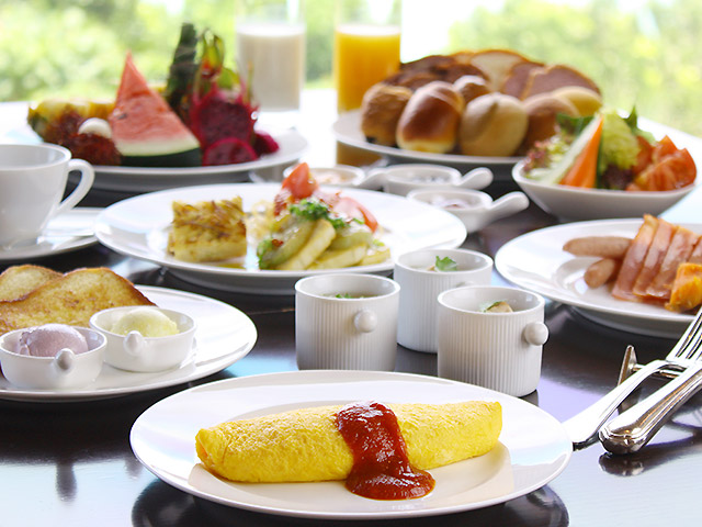 1日の始まりを美味しい朝食から楽しめる、焼き立てのフレンチトーストと、シェフが目の前で調理するふわふわオムレツが大人気。沖縄県産食材も豊富で、オムレツの具はゴーヤーやアーサ(海藻)など沖縄ならではの味を楽しむことができるのもおすすめだ。