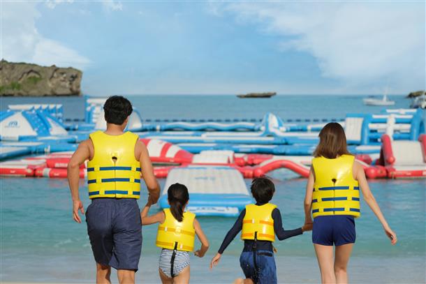 トランポリンや滑り台、ビッグシーソーなど、様々な種類の遊具が浮かぶ様子は海上に浮かぶ公園のよう。沖縄の綺麗な海を活かしたフィールドで、小さい子どもから大人まで思う存分に体を動かして遊ぶことができるアクティビティだ。