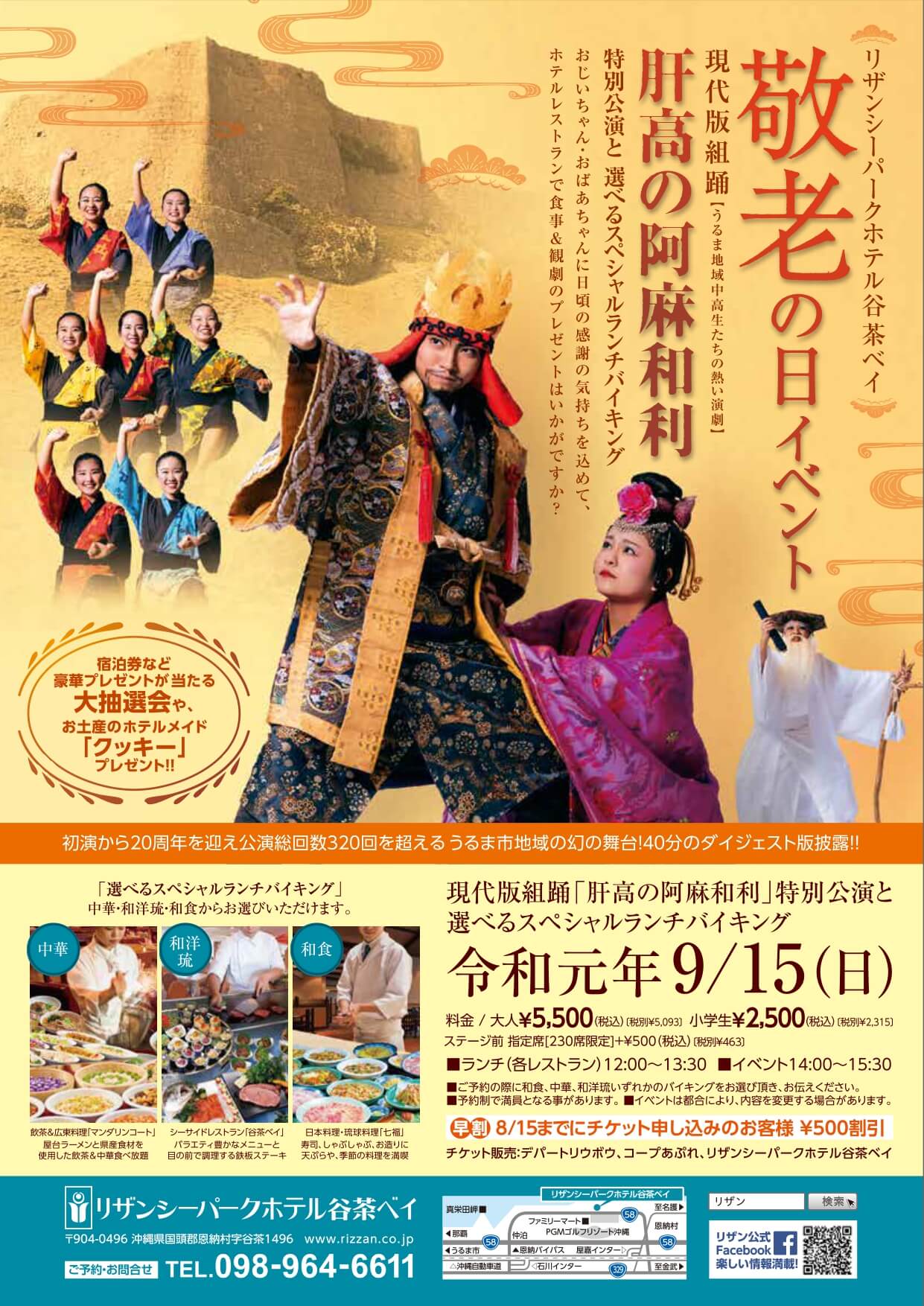 2019年9月15日(日)敬老の日にちなんだイベント、「現代版組踊 肝高の阿麻和利(きむたかのあまわり)」の特別公演が、恩納村にあるリザンシーパークホテル谷茶ベイにて開催。