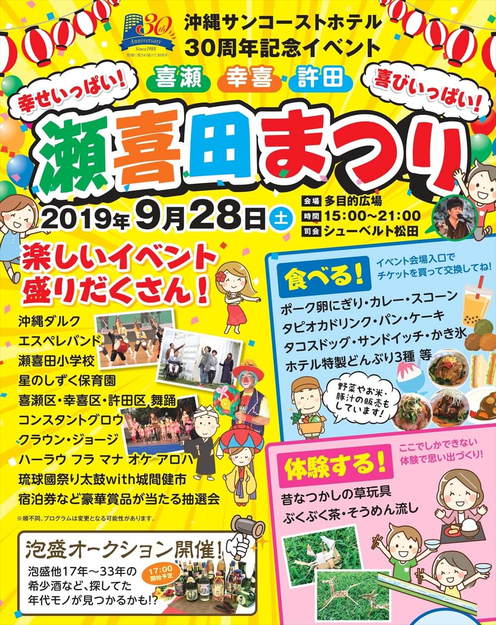 名護市にある沖縄サンコーストホテルが、2019年7月1日(月)に30周年を迎えた。それを記念し2019年9月28日(土)に、「瀬喜田まつり」を開催。