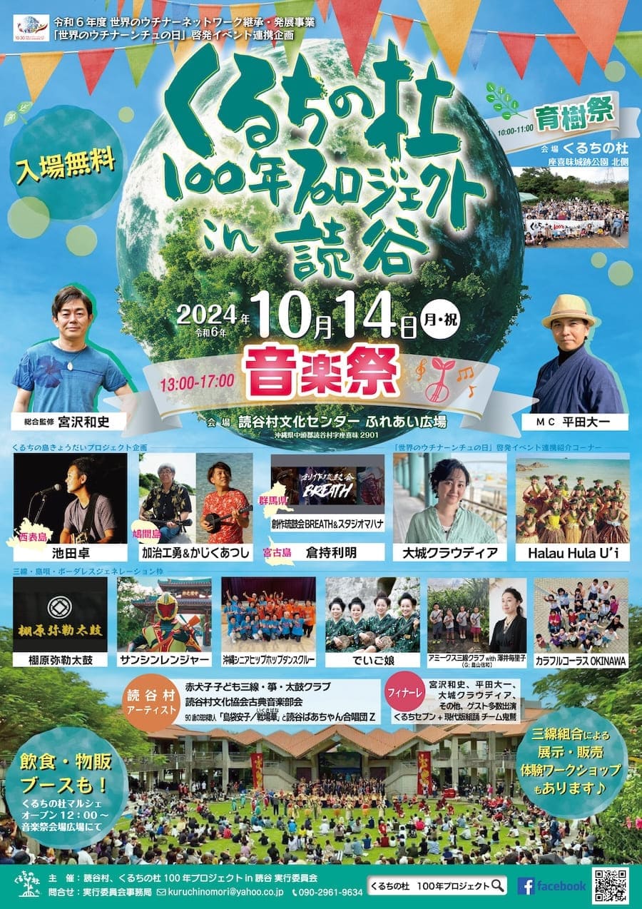 2024年10月14日(月・祝)、「くるちの杜100年プロジェクト in 読谷」の催し物として、座喜味城跡公園内くるちの杜で「育樹祭」、読谷村文化センターふれあい広場で「音楽祭」が開催される。