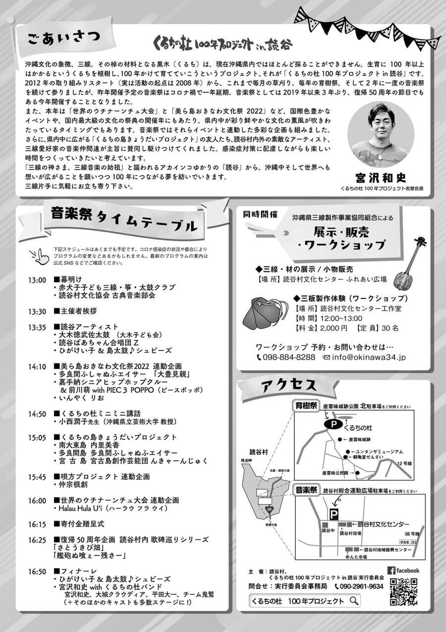 育樹祭では、くるちの苗の植樹や育樹が行なわれ、音楽祭では宮沢和史さんをはじめ、読谷村内外のアーティストたちがパフォーマンスを披露する。