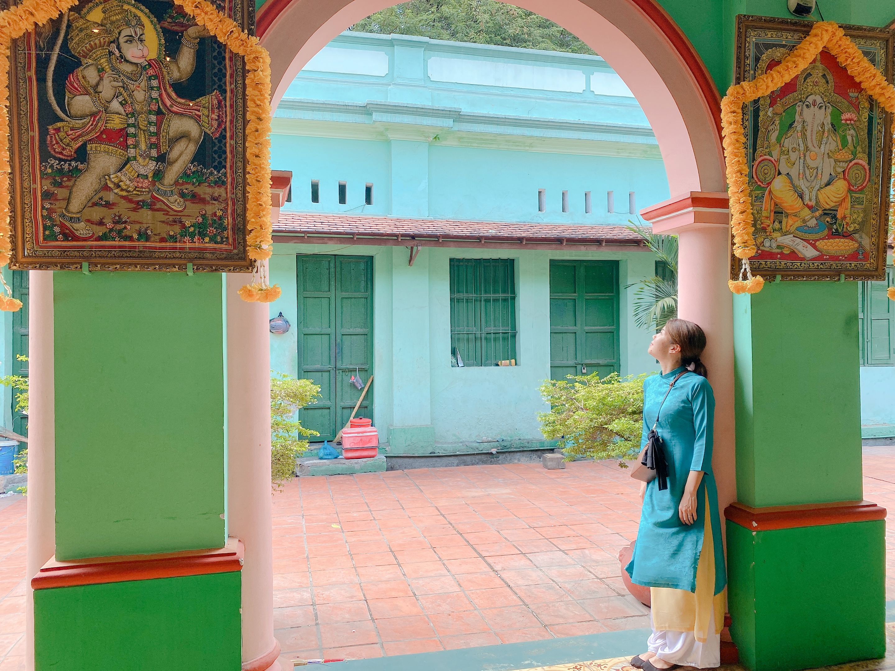 1880年に造られたベトナムでは珍しいヒンドゥ寺院。パステルグリーンと花柄の壁画が可愛らしい。