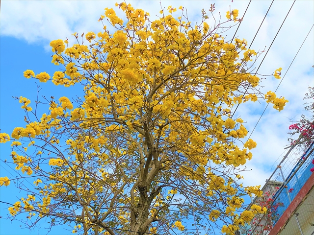 毎年、2~4月頃に鮮やかな黄色い花を咲かせる、ノウゼンカズラ科の落葉高木でブラジル原産。沖縄では”たくさん”という意味の「イッペー」いわれて親しまれている。