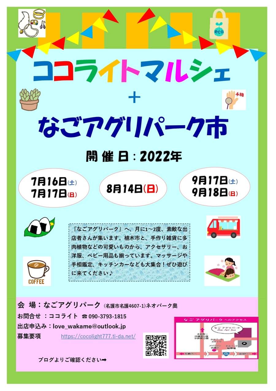 2022年7月16日(土)と17日(日)の2日間、名護市にあるなごアグリパークで「ココライトマルシェ+なごアグリパーク市」が開催される。