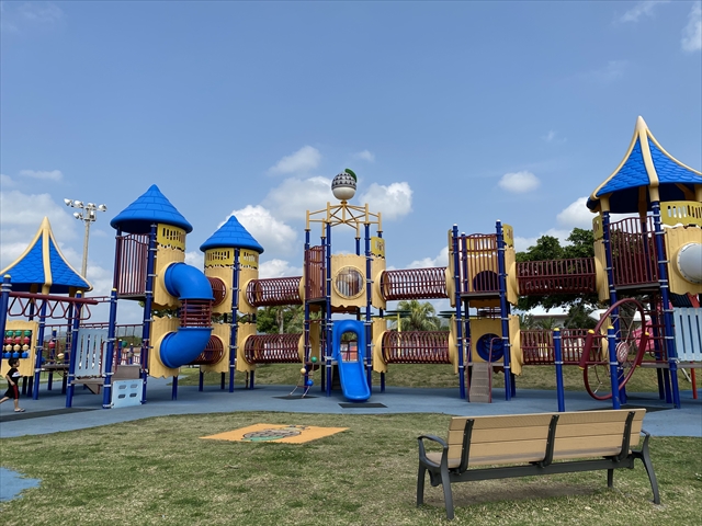金武町の公民館や体育館、陸上競技場のある敷地内にあり、公園内には子供に人気の大型遊具や、野球ができるグラウンド、遊歩道、健康遊具などがあり、広い年代の方にも人気のスポット。