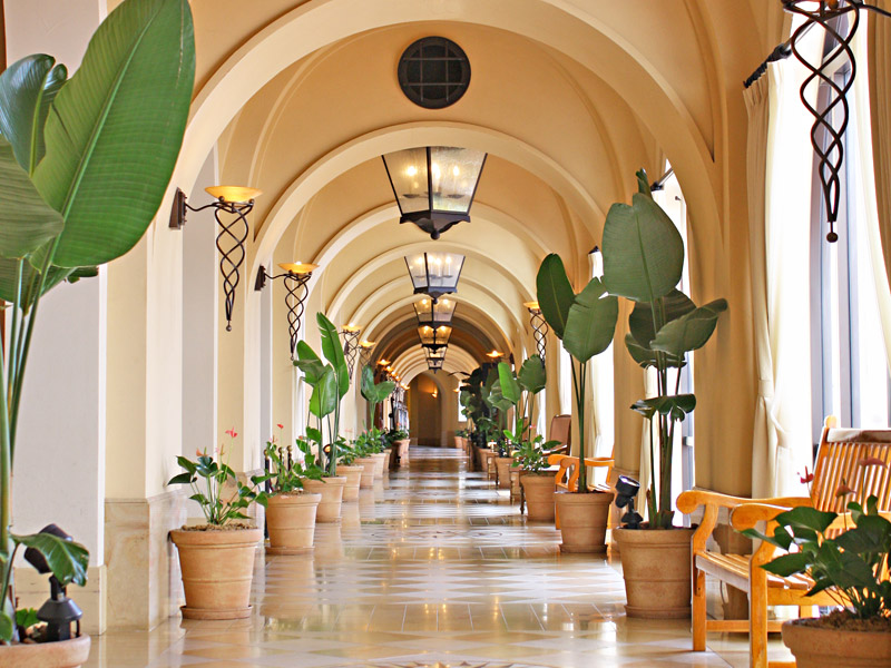 目の前のオキナワブルーの海に映える赤瓦屋根に白い壁のスパニッシュコロニアルスタイルの外観のリゾートホテル。客室内のこだわりの調度品や館内至るところにあるアート作品など、異国情緒をたっぷりと堪能できる。