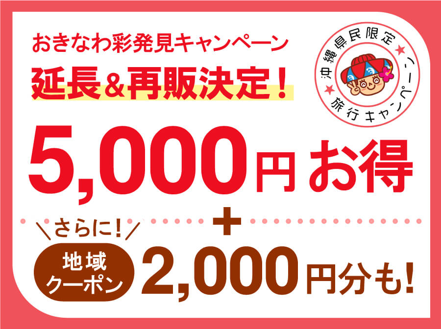 ※おきなわ彩発見キャンペーンにおきまして、弊社ちゅらとくは沖縄県及びおきなわ彩発見キャンペーン事務局の規定・判断・確定の元、プランの販売や情報のご提供をしております。ご利用に際し、最新情報についてはおきなわ彩発見キャンペーン公式サイトをご確認ください。