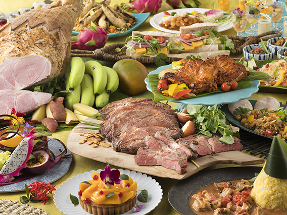 ダイニングルーム センス/ブッフェ土日祝限定のホリデーランチブッフェでは、焼きたてステーキ&アジアン料理が食べ放題。ライブキッチンには焼きたてステーキに加え、ポリネシアンソースで味わう骨付き豚もも肉のバナナの葉包みローストをはじめ、アジアン料理を中心に楽しめる。ちゅらとくからの予約で3,025円⇒2,600円に。さらに、女性2名につき1名が半額の1,513円になるお得な特典付き。