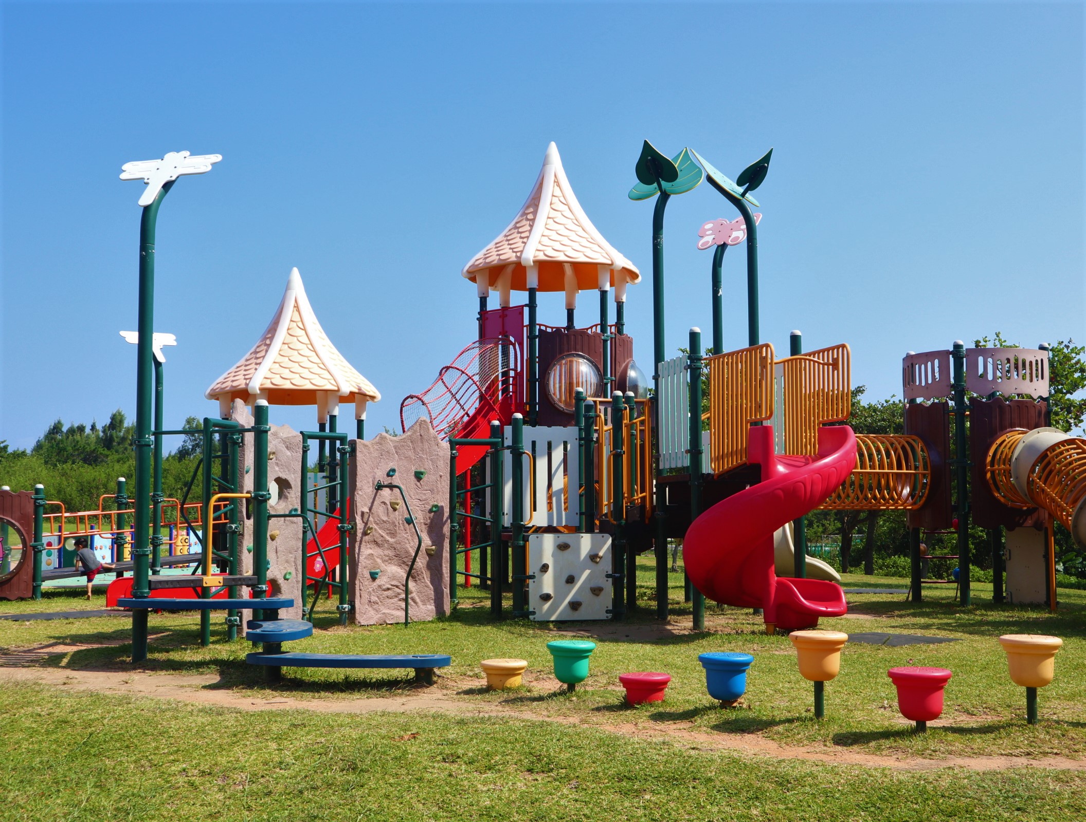 大型遊具のほかに、多目的広場、ヤギやカメとのふれ合いコーナー、レストラン、BBQ場などの充実した公園だ。