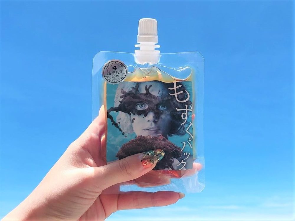 2019年9月に、もずくコスメ第一弾として発売された「もずくパック」のラベルは、二度見してしまうほどのインパクト。
