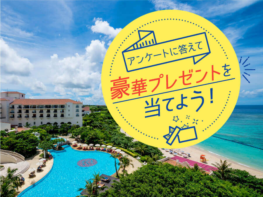アンケートにご協力いただいた方の中から抽選で「ホテル日航アリビラ」ペア宿泊券(朝食付)が当たるほか、後日実施するオンライン座談会に参加いただいた方には「ロワジールホテル那覇」ペアランチ券をプレゼント。