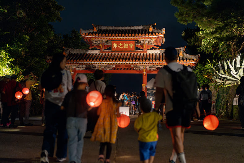 首里城では、「うむいの燈ランタン夜市」が開催される。ランタンウォークに参加していなくても、誰でも入場可能なイベント。キッチンカーや生ビールの販売ブースのほか、「SYURI NO UTA スペシャルライブ」などが行われる。ランタンウォーク参加者以外の方も、ぜひ首里城を訪れて、秋の夜長を楽しんで。
