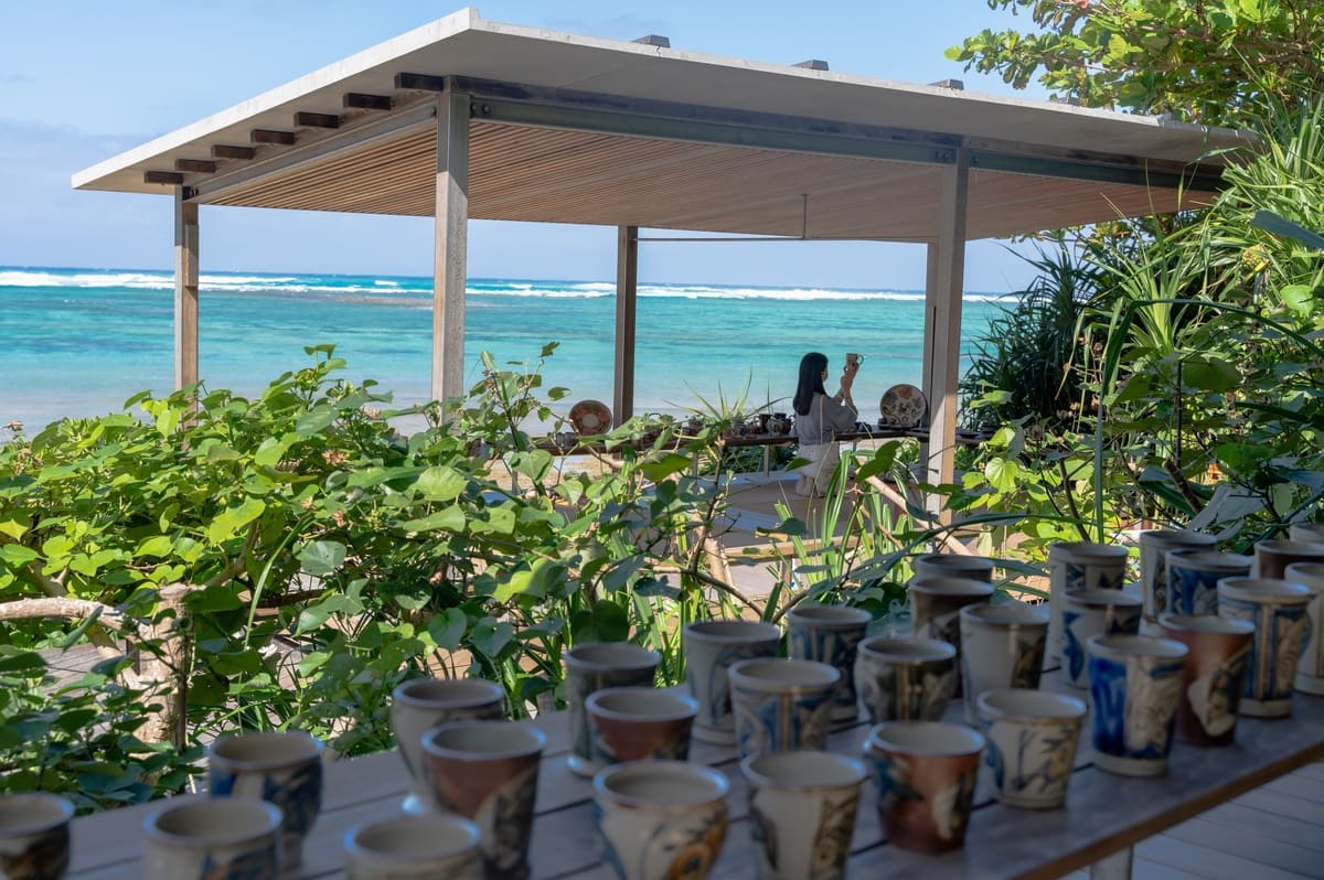 バンタカフェがある読谷村には、登り窯で有名な「やちむんの里」をはじめ、70以上もの工房が存在している。イベント期間中、「海辺のやちむん市」では、読谷村内の各工房から器を集めて展示を行う。のんびりと過ごしながら、やちむんの魅力を感じよう。