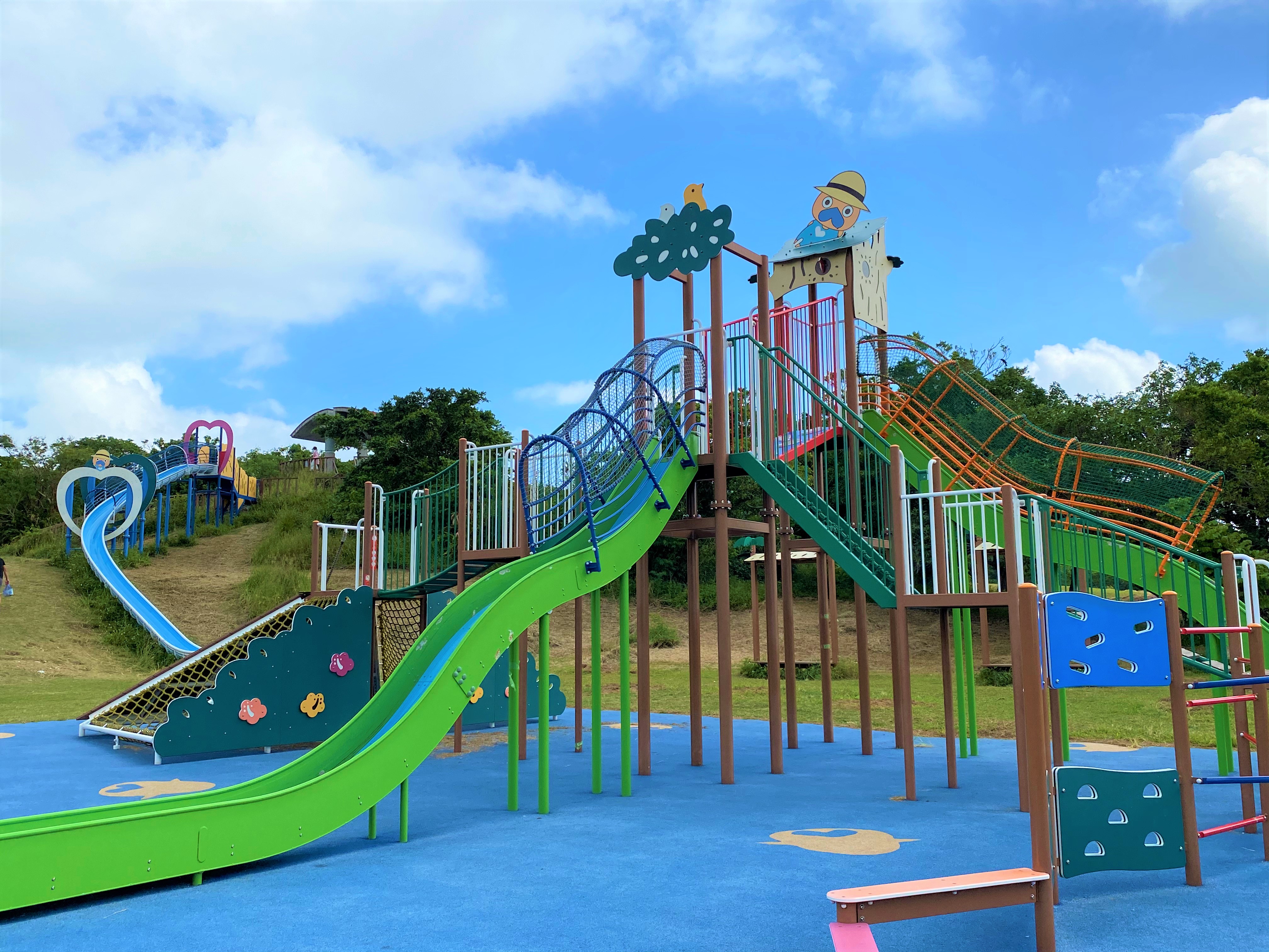 南城市玉城の高台にある自然豊かなグスクロード公園は、大型遊具のほかに、多目的広場、ヤギのふれ合いコーナー、太平洋を一望できる展望台など、遊ぶ、見る、触れ合えるの三拍子が揃ったスポットだ。