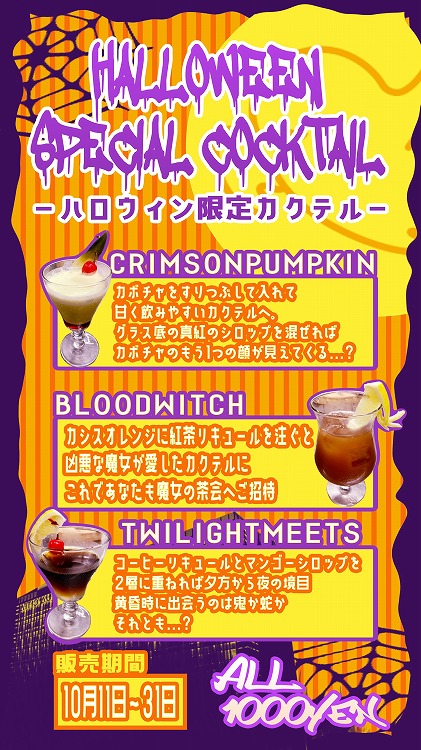 イベント中はカボチャを使用した甘く飲みやすいカクテルや、カシスオレンジに紅茶リキュールを合わせたカクテルなど、ハロウィン限定メニューも登場。