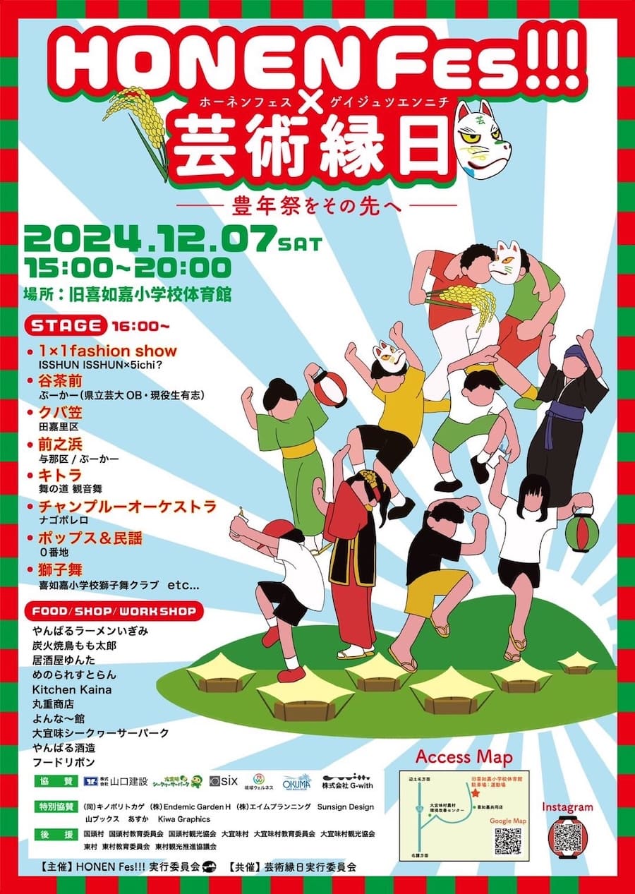 2024年12月7日(土)、大宜味村にある喜如嘉翔学校(旧喜如嘉小学校)で「HONEN Fes × 芸術縁日」が開催される。