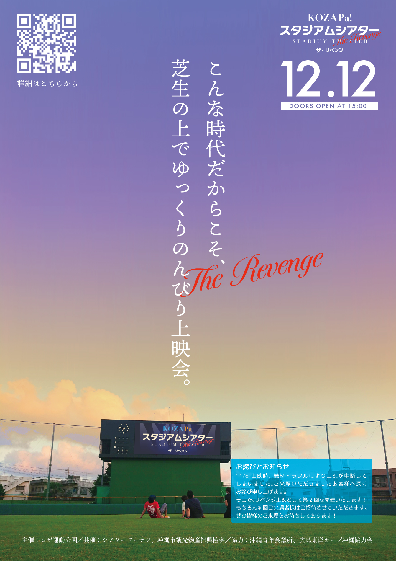 沖縄市にあるコザしんきんスタジアムでは、スタンド席や野外芝生で映画が楽しめる「KOZAPa!スタジアムシアター ザ・リベンジ」が、2020年12月12日(土)に開催。