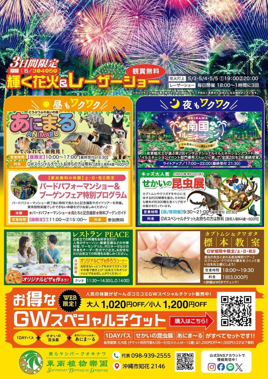 5月3日(土・祝)~5日(月・祝)の3日間は、特別花火&レーザーショーが夜空を彩る。昼と夜2度楽しめる「おきなわブーゲンフェア」や、17時からは「沖縄南国イルミネーション」も開催中。時間帯で様々なプログラムが楽しめる東南植物楽園でGWを満喫してみてはいかが。