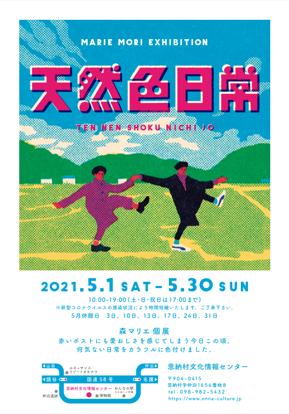 イラストレーターの森マリエの個展「天然色日常」が、2021年5月1日(土)~30日(日)の期間、恩納村文化情報センターで開催。