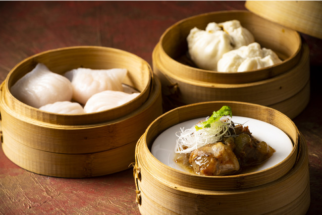 土日限定のランチタイムではシェフがテーブルを訪れ、肉汁たっぷりの小籠包や10種類の熱々点心をワゴンスタイルで提供。さらにスイートとしてアフタヌーンティーも一緒に楽しめる。