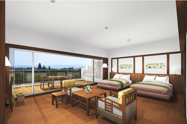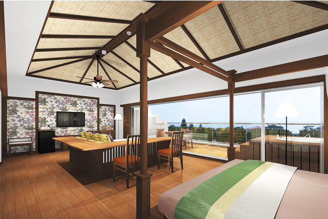 改装中の客室はロイヤルスイートを除く94室。客室に沖縄を代表する伝統的な染色技法「紅型」を取り入れ、沖縄の海と空、宿泊棟の赤瓦が広がる窓からの景色と共に、より沖縄を身近に感じる空間が広がる。