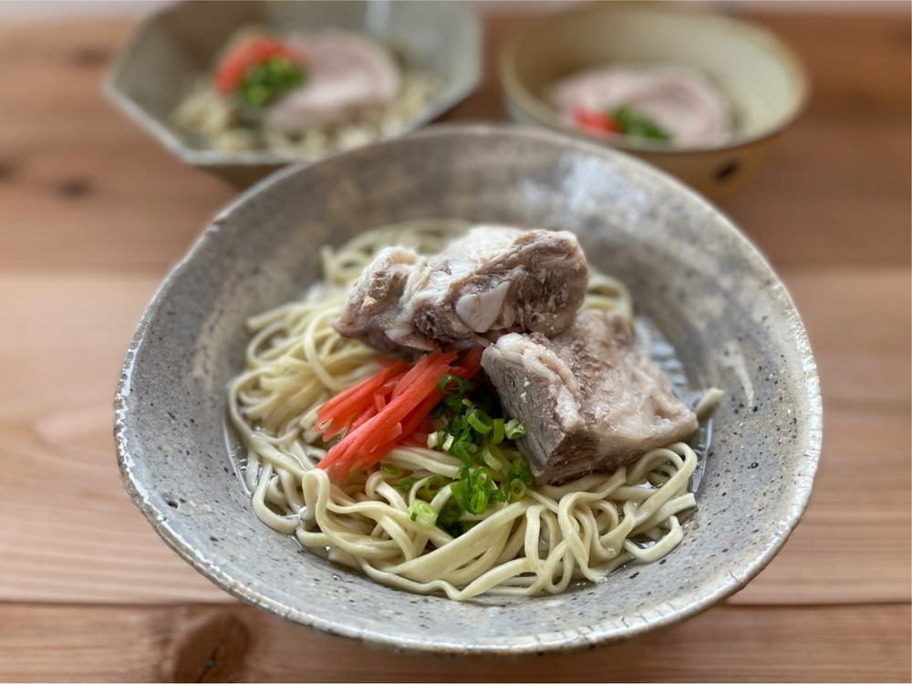 無化調にこだわった沖縄そばは「本ソーキそば」と「三枚肉そば」の2種類のみで、本ソーキと三枚肉は沖縄産豚を使った自家製。「最後まで飲み干せるスープ」をコンセプトに、出汁のベースは沖縄県産鶏、鹿児島県枕崎市の鰹節を使用。