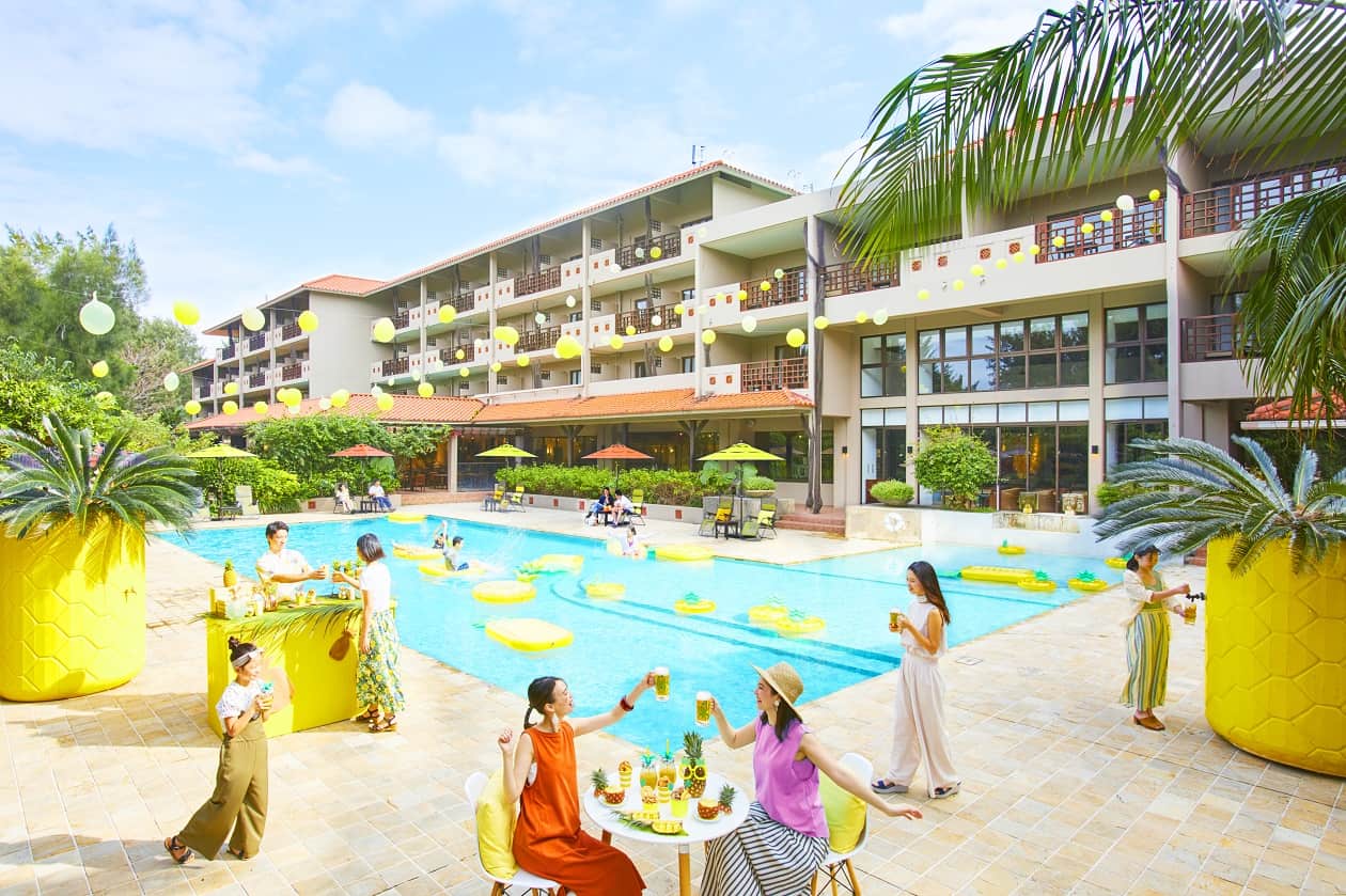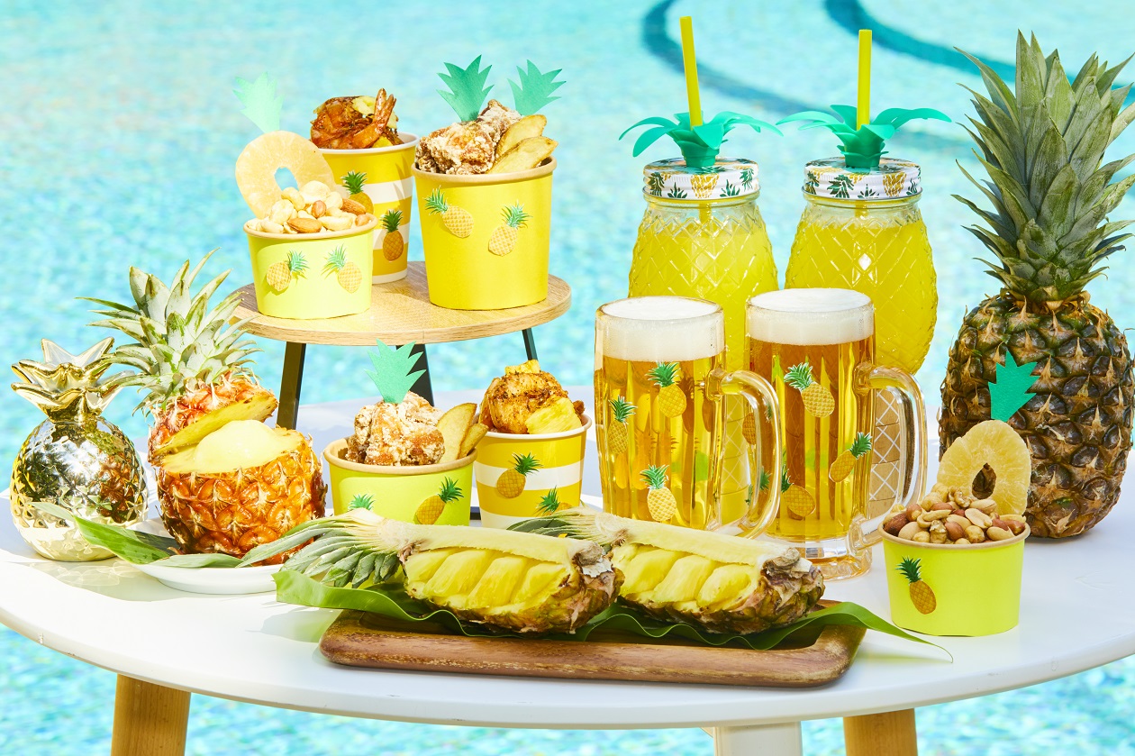 イベント期間中は、プールサイドにあるパラソルやチェア、クッションなどがパイン色に変わるほか、浮き輪やアームフローなどプールを楽しむために用意したグッズもパイン色に。