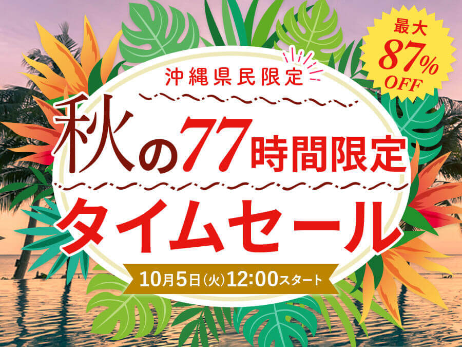 ちゅらとくでは2021年10月5日(火)12時~8日(金)17時まで、ホテル宿泊やホテルレストラン、遊び・体験、ツアーから250以上の期間限定プランが登場する「秋のタイムセール」を開催。