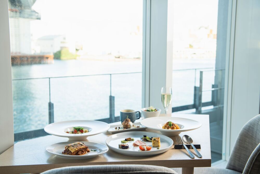 大パノラマのハーバービューと、泊大橋を間近に望む開放的なロケーション。人気のランチセットではパスタやリゾット、ラザーニャが食べ放題。前菜6種盛り合わせ、自家製フォカッチャ、ドリンクバー、デザートプレートまで付いた豪華セット内容となっている。