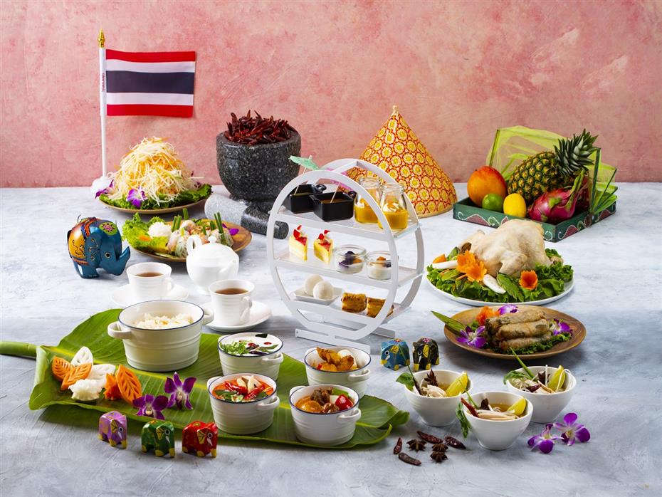 アフタヌーンティースタンドにはマンゴープリンやココナッツ団子、ブアローイなどペストリーシェフ特製のタイデザートをデコレーション。