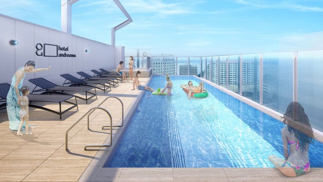 地上14階建てで全240室の客室を有し、館内には開放感抜群のルーフトッププールと水着で入れるサウナも完備。