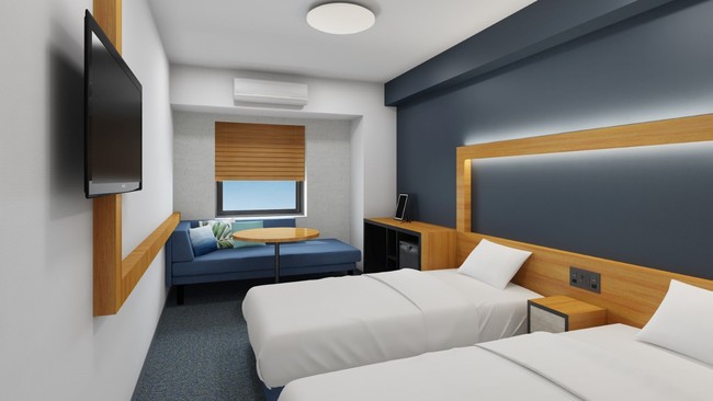 客室内にはソファベッドを設置して、ゆったり快適に過ごる造りとなっている。全室にミラータイプのタブレット型端末を装備し、ホテル内のレストランの料理デリバリーを気軽に注文できるほか、様々なサービスを提供する予定。