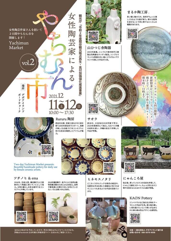 2021年12月11日(土)~12日(日)まで、北谷町美浜のデポアイランドボードウォークで「女性陶芸家によるやちむん市vol.2」が開催。