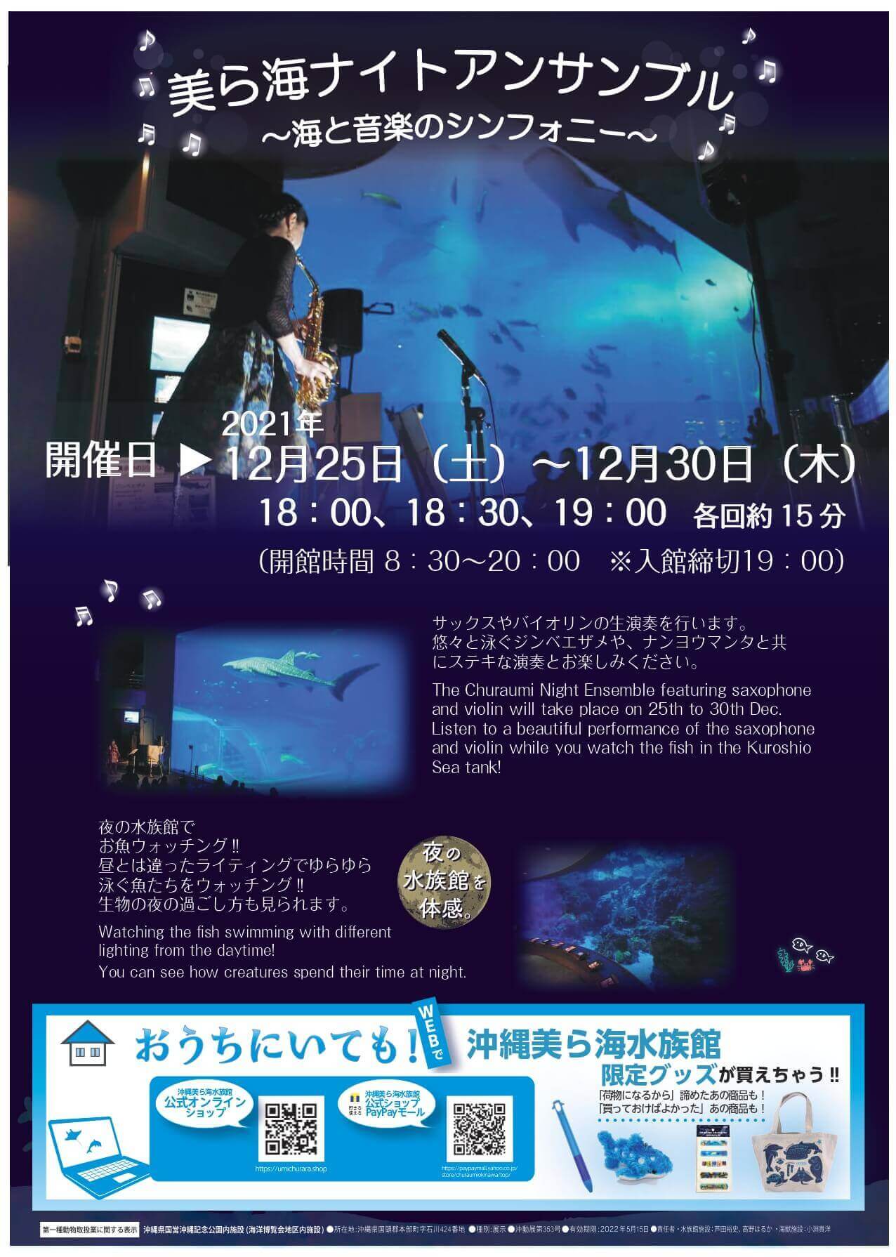 2021年12月25日(土)~30日(木)、本部町にある沖縄美ら海水族館で「美ら海ナイトアンサンブル ~海と音楽のシンフォニー~」が開催される。