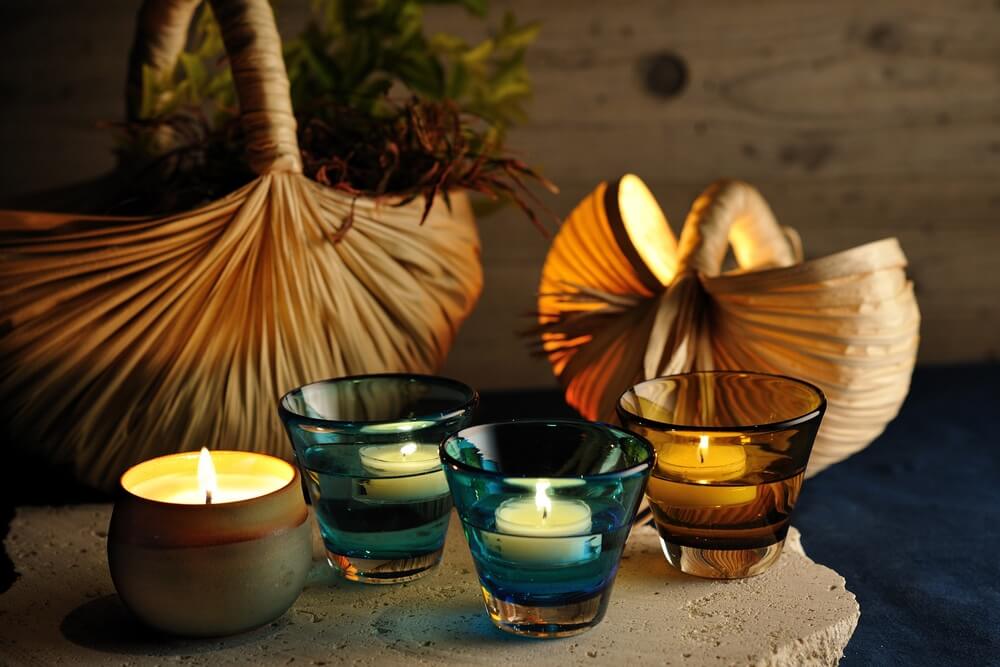 沖縄の自然や文化を大切にするクラフト作家が集うマルシェでは、週替りで4~5店舗が出店。再生ガラスを使った琉球ガラスのキャンドルホルダー、海がモチーフのキャンドル、沖縄伝統の芭蕉紙のランプシェードなど、あかりと共に夜の時間をより豊かにする作品が揃う。