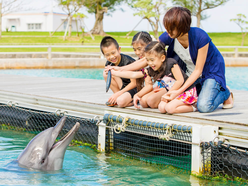 「もとぶ元気村」は本部町にある人気観光スポット。年間を通じて、イルカとふれあえるドルフィンプログラムやマリンプログラム、文化体験プログラムを実施。体験できるプログラム数は約60種類を誇る。