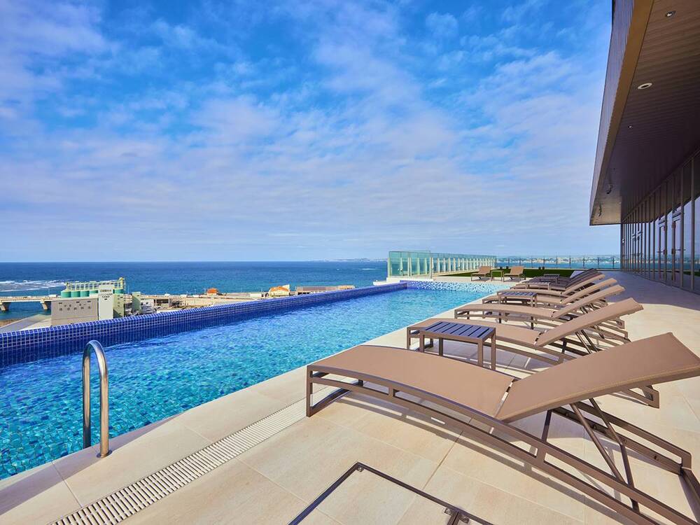 9階にはホテル自慢のインフィニティプールがあり、子ども用のキッズプールも完備。夜はライトアップされ、浦添の夜景とともに非日常を体感できる。