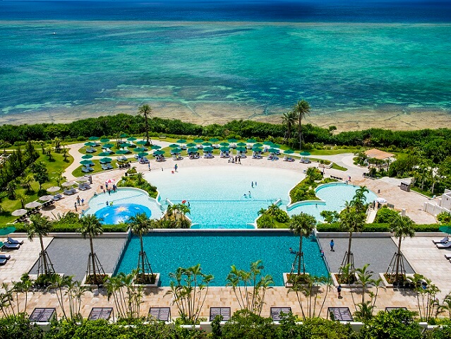 恩納村にあり、機能性と居住性を兼ね備えた客室と上質なサービスで定評のあるホテルモントレ沖縄 スパ&リゾート。ここには誰もが楽しめる屋外プールと屋内プールがある。