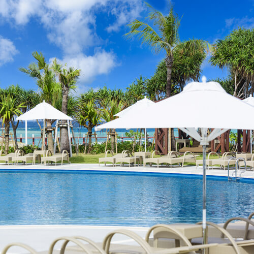 屋外プールはビーチに隣接し、緑の芝生と白いタイルが美しい。海からの爽やかな潮風を受けながら、オン・ザ・ビーチホテルならではの贅沢な時間が過ごせる空間となっている。